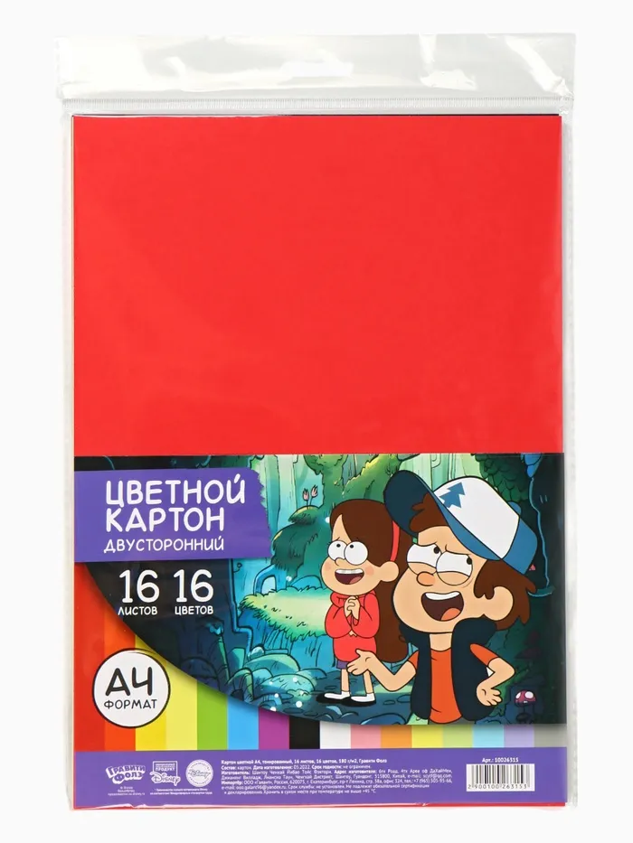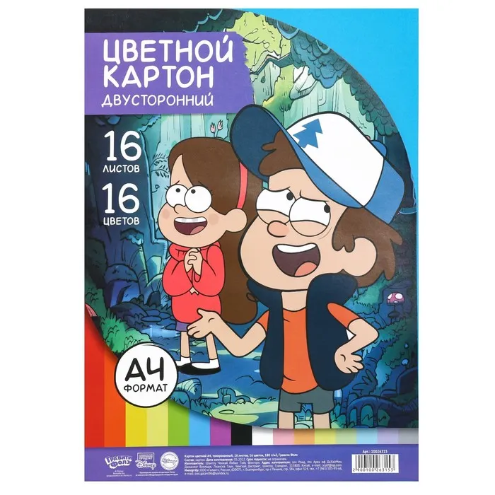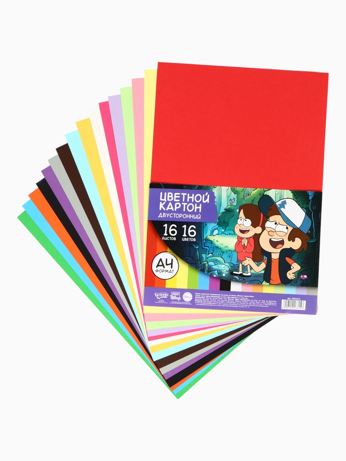 Цветной картон, А4, 16 листов, 16 цветов, немелованный, двусторонний, в папке, 180 г/м², «Гравити Фолз» — Характеристики