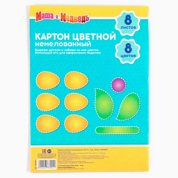 Цветной картон, А4, 8 листов, 8 цветов, немелованный, односторонний, в папке, 220 г/м², «Маша и медведь» — Характеристики