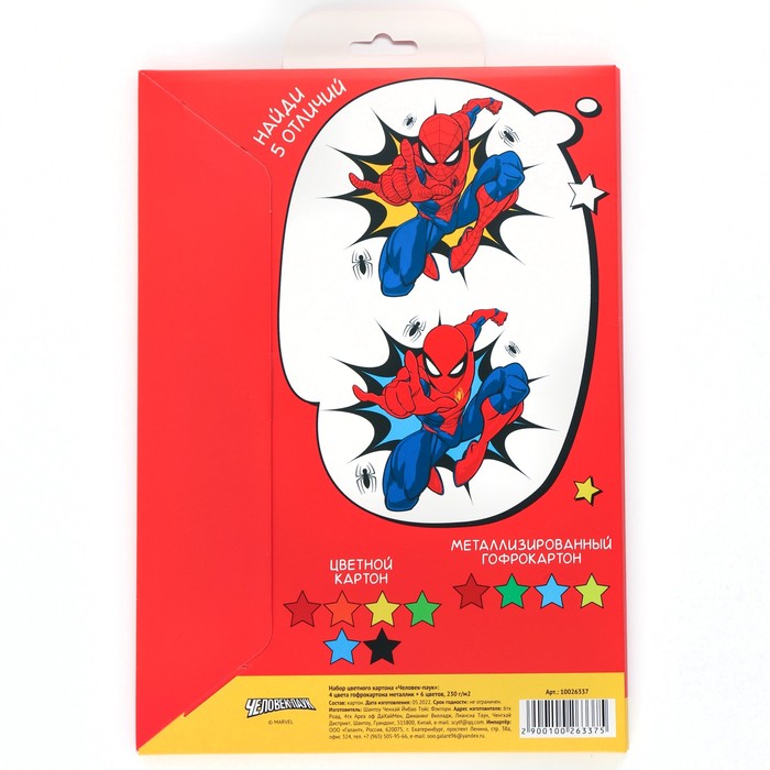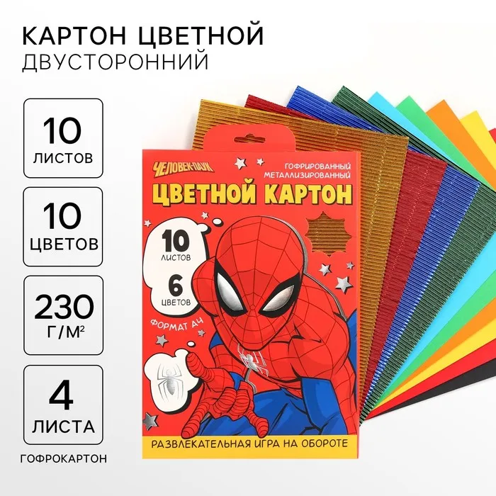 Цветной картон гофрированный, А4, 10 листов, 10 цветов, немелованный, двусторонний, в папке, 230 г/м², «Человек-паук» — Характеристики