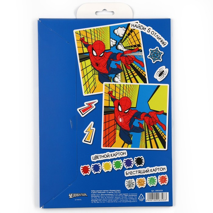 Цветной картон с блёстками, А4, 10 листов, 10 цветов, немелованный, двусторонний, в папке, 250 г/м², «Человек-паук» — Характеристики