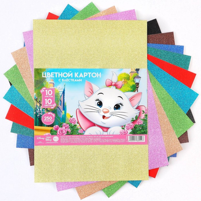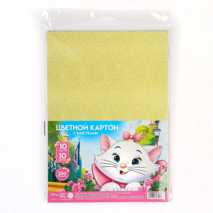 Цветной картон с блёстками, А4, 10 листов, 10 цветов, немелованный, односторонний, в пакете, 250 г/м², «Коты аристократы» — Характеристики