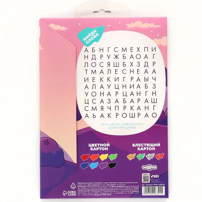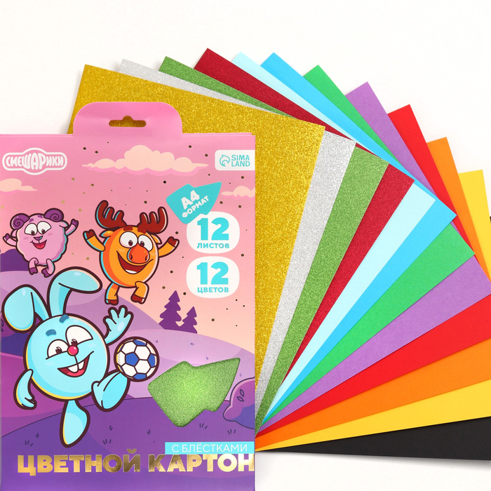 Цветной картон с блёстками, А4, 12 листов, 12 цветов, немелованный, двусторонний, в папке, 250 г/м², «Смешарики» — Характеристики