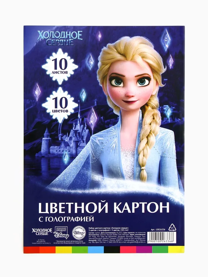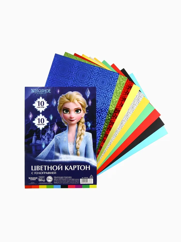 Цветной картон с голографией, А4, 10 листов, 10 цветов, немелованный, двусторонний, в папке, 250 г/м², «Холодное сердце» — Характеристики