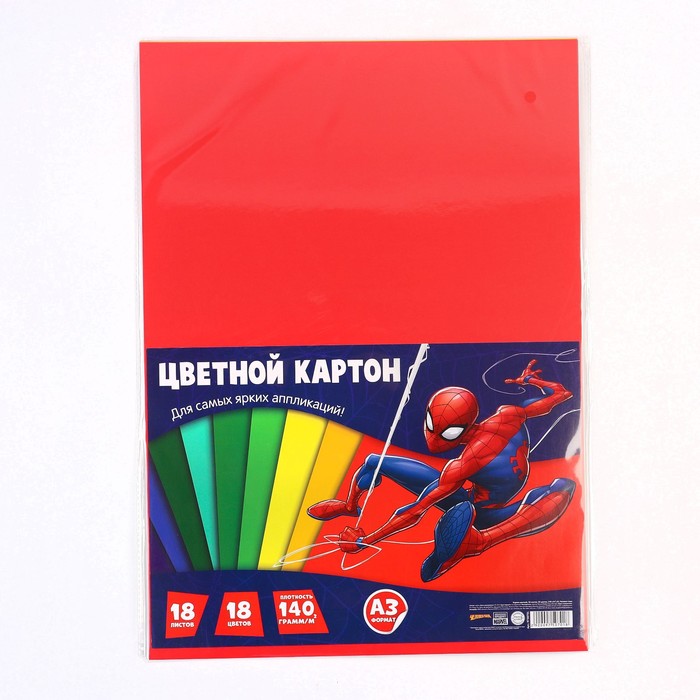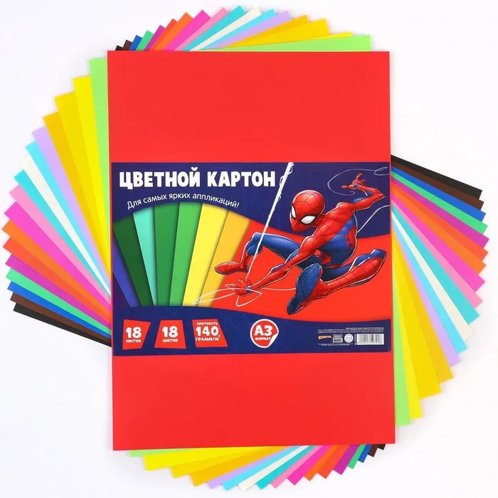 Цветной картон тонированный, А3, 18 листов, 18 цветов, немелованный, двусторонний, в пакете, 140 г/м², «Человек-паук» — Характеристики