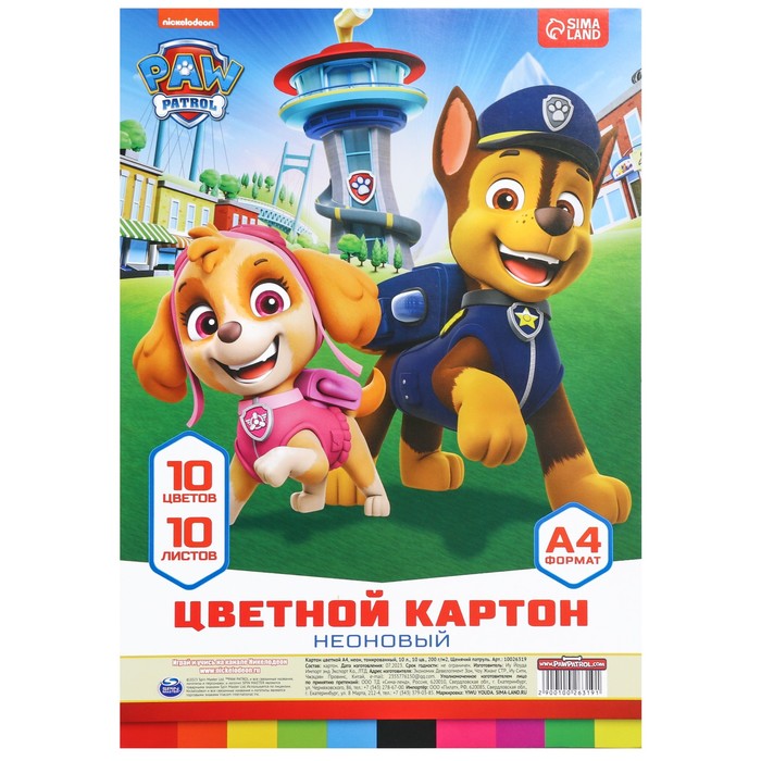 Цветной картон тонированный, А4, 10 листов, 10 цветов, немелованный, двусторонний, в пакете, 200 г/м², «Щенячий патруль» — Характеристики
