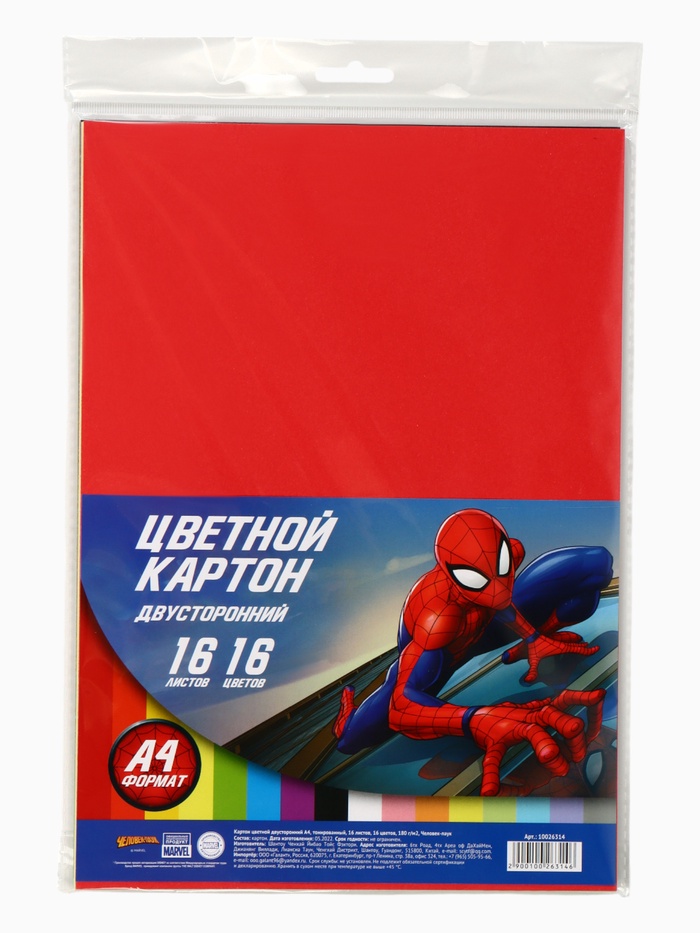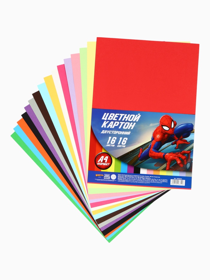 Цветной картон тонированный, А4, 16 листов, 16 цветов, немелованный, двусторонний, в пакете, 180 г/м², «Человек-паук» — Характеристики