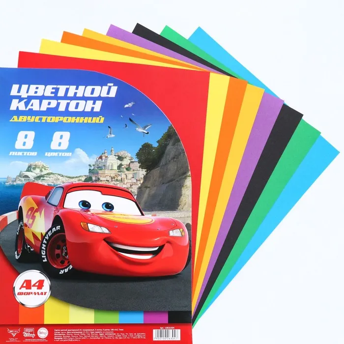 Цветной картон тонированный, А4, 8 листов, 8 цветов, немелованный, двусторонний, в пакете, 180 г/м², «Тачки» — Характеристики