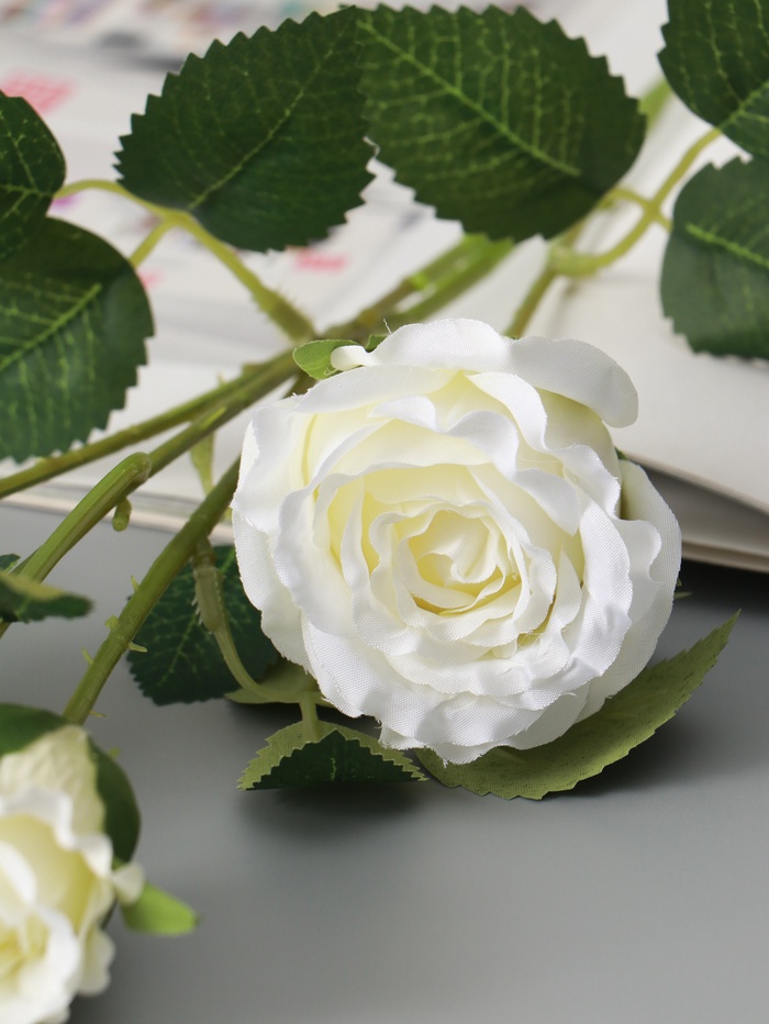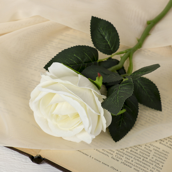 - Реалистичная текстильная роза: Лепестки из качественного текстиля точно передают нежную структуру живого цветка. Плотный бутон белого цвета выглядит свежо и естественно, не выгорая со временем.