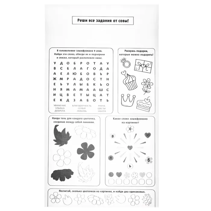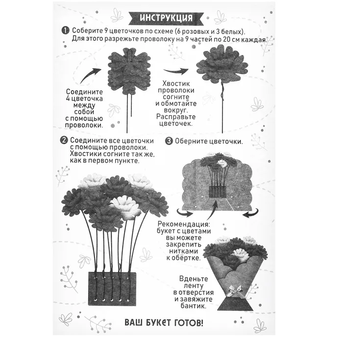В набор входят фетровые элементы, лента, проволока и инструкция. Малышу достаточно сложить уже вырезанные элементы по инструкции, вставить проволоку, а затем сформироватть цветочки и замечательный подарок готов! Открытку можно подарить близкому человеку.