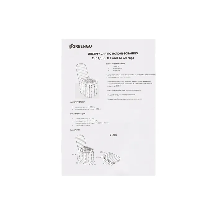 Туалет складной, 12 одноразовых пакетов, 12 пакетов абсорбента, сумка, Greengo — Характеристики