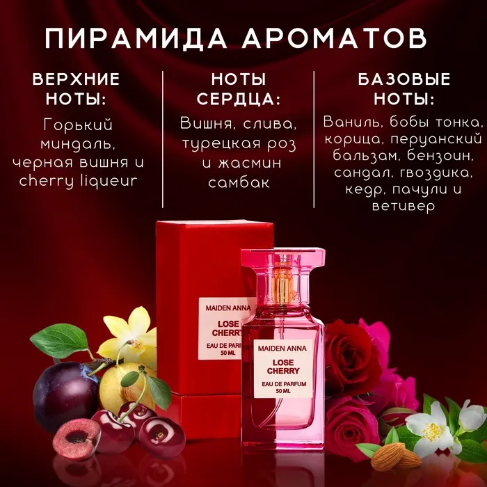 Maiden Anna Lose Cherry — туалетная вода с восточно-цветочным ароматом для женщин и мужчин. Смелый насыщенный соблазнительный аромат посвящен густому кисло-сладкому запаху душистой наливной вишни, который дарит счастливое, радостное и солнечное летнее настроение.