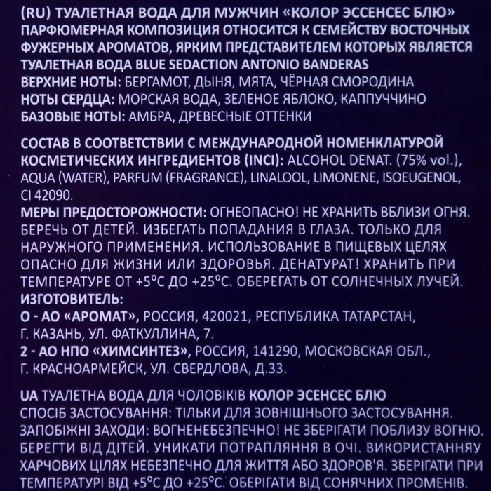 Состав: alcohol denat. (79% vol.), aqua (water), parfum (fragrance), linalool, limonene, butylphenyl methylpropional, coumarin, benzyl benzoate, ci 42090, ci 15985