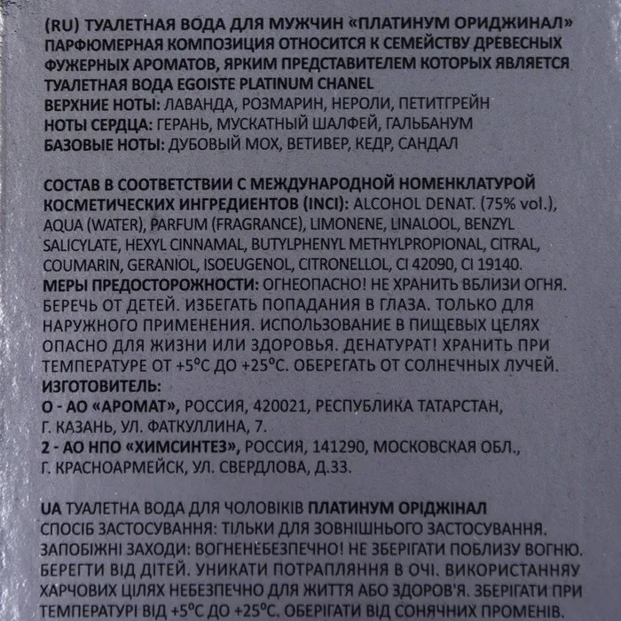 Туалетная вода мужская Platinum Original, 100 мл (по мотивам Egoiste Platinum (Chanel) — Характеристики