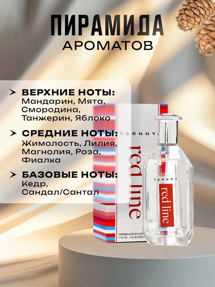 Этот современный, энергичный женский аромат. Композиция аромата Tarnny Red Line открывается легкими нотами смородины и яблока, мяты, тангарина и мандарина, которые постепенно насыщаются нотами сердца: магнолией и вересом, розой и жимолостью, лилией и фиалкой. Завершается ароматная композиция шлейфовыми нотами сандалового дерева и кедра.