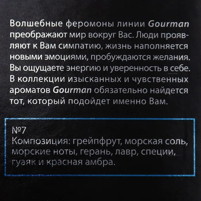 Волшебные феромоны лини Gourman преображают мир вокруг вас. Люди проявляют к вам симпатию, жизнь наполняется новыми эмоциями, пробуждаются желания. Вы ощущаете энергию и уверенность в себе. В коллекции изысканных и чувственных ароматов Gourman обязательно найдётся тот, который подойдёт именно вам.