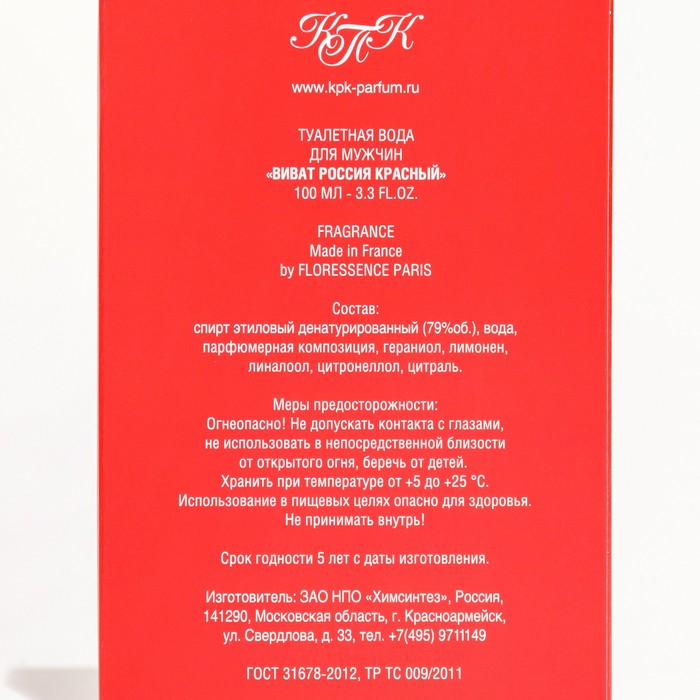 И для мужчины, и для женщины важно, чтобы аромат отражал их индивидуальность и социальный статус, идеально подходил к разным образам. В линейке Кпк есть много оригинальных композиций, которые пользуются большой популярностью. Виват Россия! Красный — одна из них. Букет красиво раскрывается на коже, запах долго не выветривается.