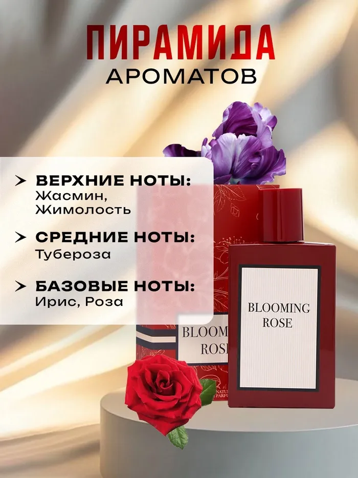 Верхний аккорд композиции дарит тонкий, чуть трепковатый аромат жасмина и пряно-медовый запах жимолости. По мере приближения к сердечному аккорду им на смену приходит более густой и насыщенный пряно-лилейный аромат индийской туберозы. Тогда как на финальном этапе звучания парфм дарит бархатисто-медовый аромат дамасской розы и пряно-пудровые оттенки тосканского ириса.