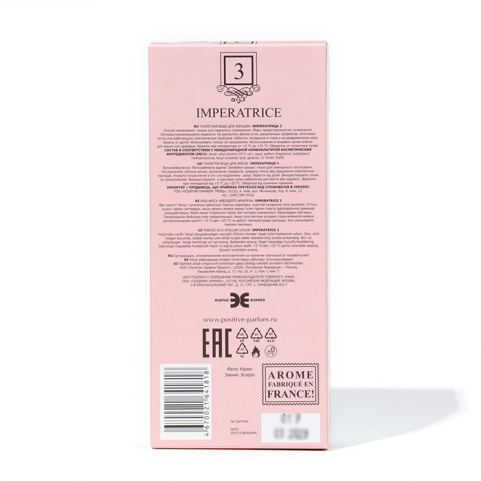 Туалетная вода "Imperatrice" - это аромат для женщин, которые ценят свободу, активность и свежесть. Он подчеркнет вашу неповторимую индивидуальность и подарит ощущение легкости и жизненной радости. Идеальный выбор для повседневного использования.