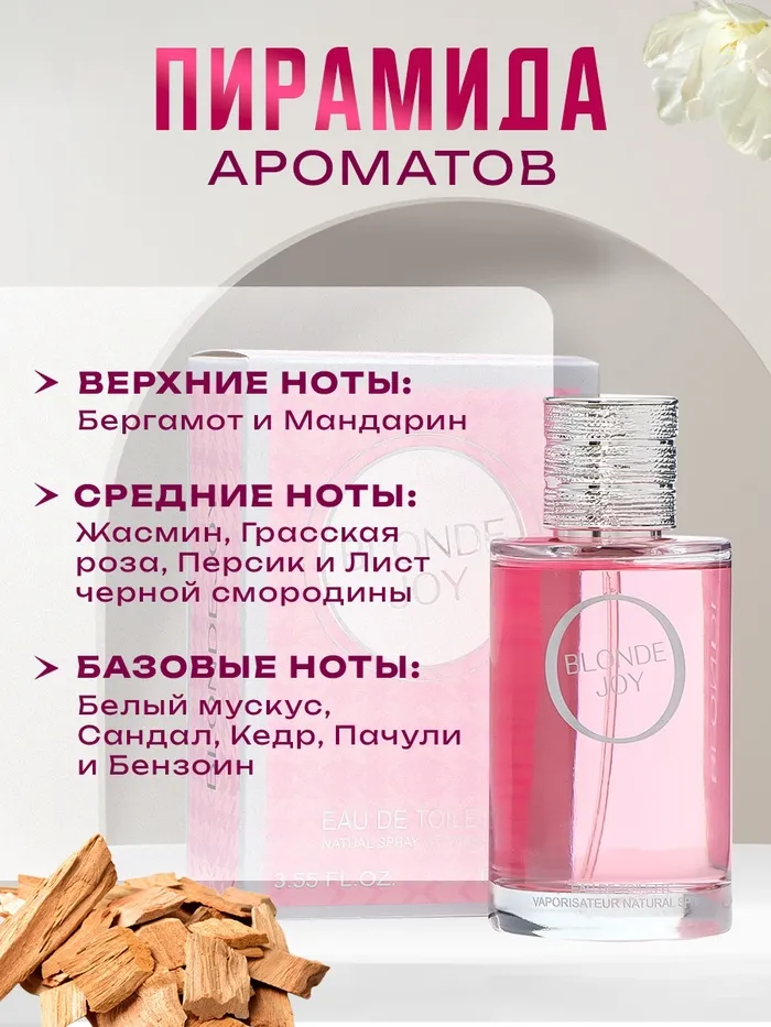 Лаконичная, идеально сбалансированная, композиция парфюма Blonde Joy изысканно сплетена из свежих искристых богатых цитрусовых оттенков, пьянящих насыщенных цветочных нот бархатисто-пряной медовой розы и страстного белого жасмина, элегантных древесных аккордов нежного сливочного сандала на теплом чувственном фоне драгоценного белого мускуса.