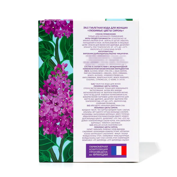 Начальные ноты туалетной воды раскрываются свежими и сочными аккордами сирени, придающими аромату легкость и яркость. В сердце композиции расцветают более насыщенные оттенки сирени, создавая чувственное и элегантное впечатление. Базовые ноты придают аромату стойкость и завершают этот удивительный букет.