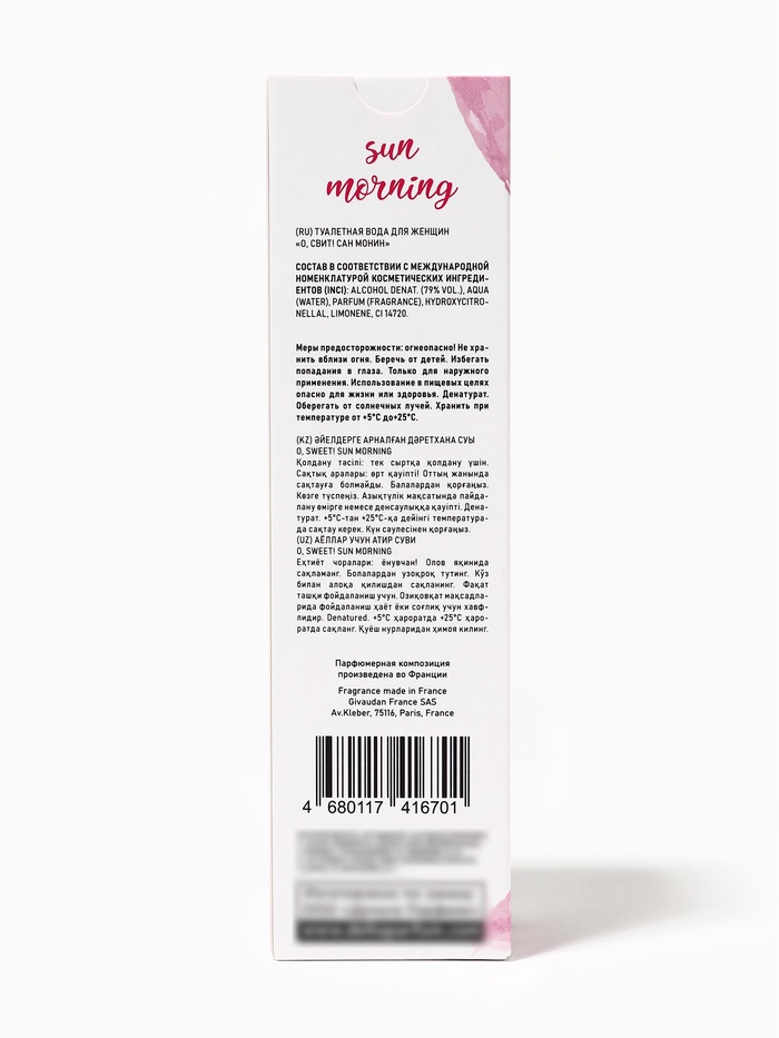 Аромат оставляет за собой лёгкий, свежий и манящий шлейф, создавая ощущение бодрости, лёгкости и внутреннего сияния. O, Sweet! Sun Morning — это парфюм для женщин, которые ценят оптимизм, ясность и утреннюю свежесть, даря себе и окружающим настроение солнечного утра.