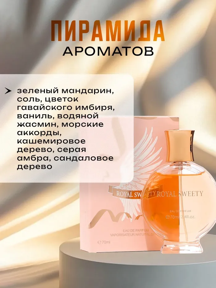 Очаровательная композиция виртуозно балансирует между реальностью и мифом, талантливыми росчерками рисуя образ современной Клеопатры. Открывается пленительный парфюм мощным всплеском морских волн. Сквозь соленые и прохладные переливы проступает чарующее благоухание имбирного цвета, чтобы раствориться в золотистых объятьях ванили и жасмина. Завершается Royal Sweety роскошным амброво-сандаловым шлейфом.