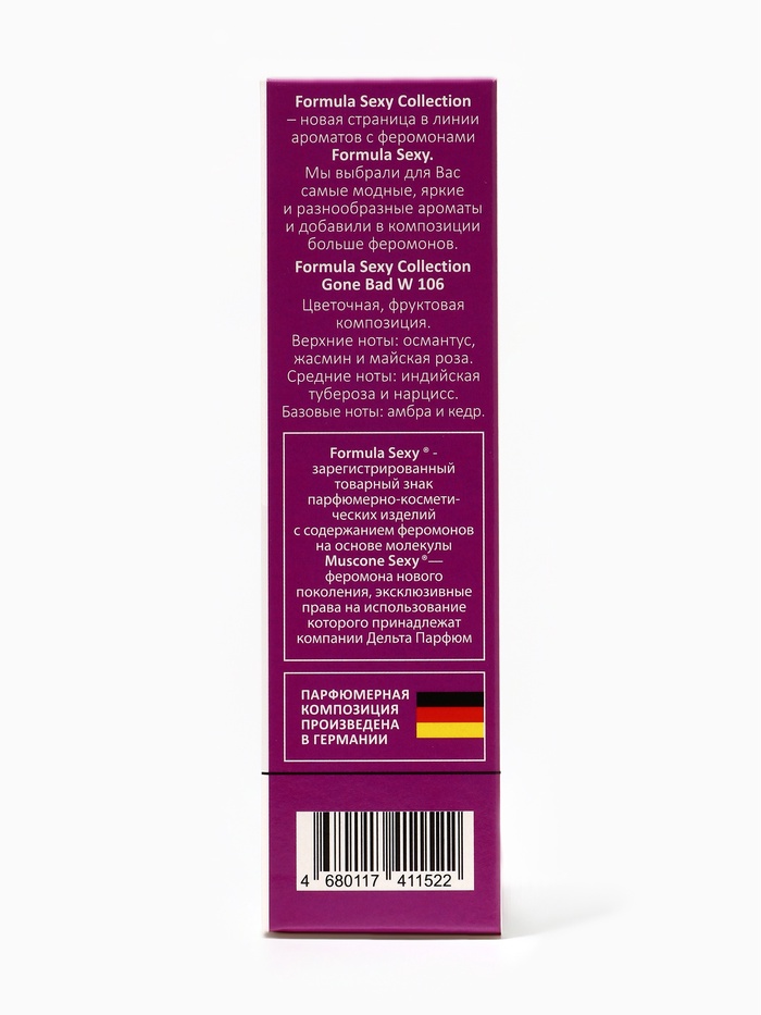 Formula Sexy Collection Gone Bad W106 — это аромат для женщин, которые хотят подчеркнуть свою дерзость, смелость и магнетическую привлекательность. Он создан для тех, кто ценит уверенность в себе, интригу и эффект притяжения. Этот парфюм с феромонами словно невидимая сила, которая усиливает обаяние и создаёт ауру загадочности и страсти.