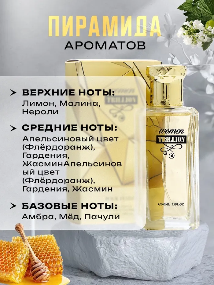 Дерзкий и нежный аромат перенесет Вас в мир желаний, искушений и фантазий. Trillion — это счастливый и желанный талисман, созданный для роковых красоток, очаровательных соблазнительниц и прекрасных обольстительниц, которых возносят и ценят, которыми восторгаются и восхищаются. Цветочно-древесная композиция освежает начальными нотами горького апельсина, смягченного яркой и сладкой малиной. В сердце аромата раскрываются утонченные ноты цветков апельсина и упоительного жасмина. Древесный шлейф ободряет и согревает аппетитными оттенками лакомого меда.