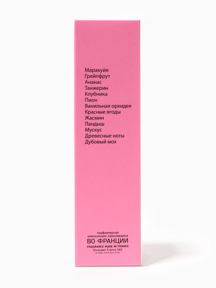 - Верхние ноты: маракуйя, грейпфрут, ананас, танжерин, клубника — создают сочное и бодрящее начало, наполняя образ свежестью и энергией.