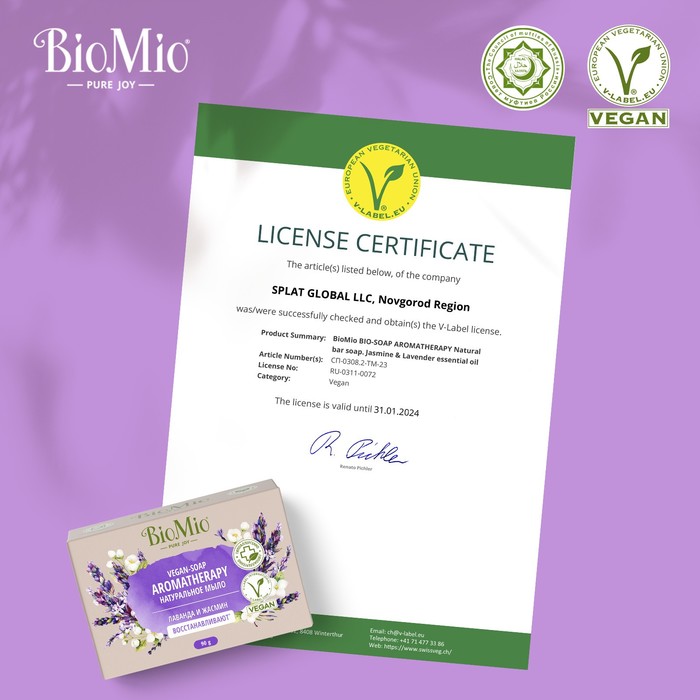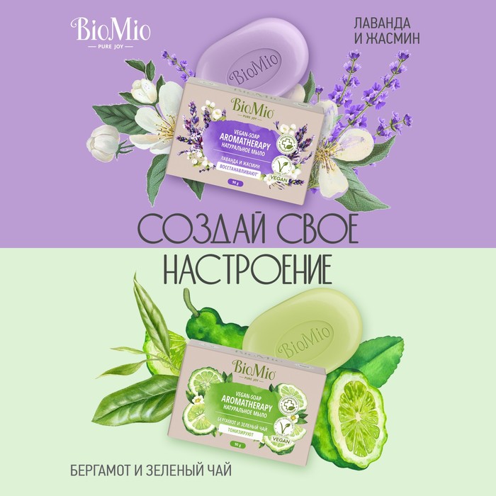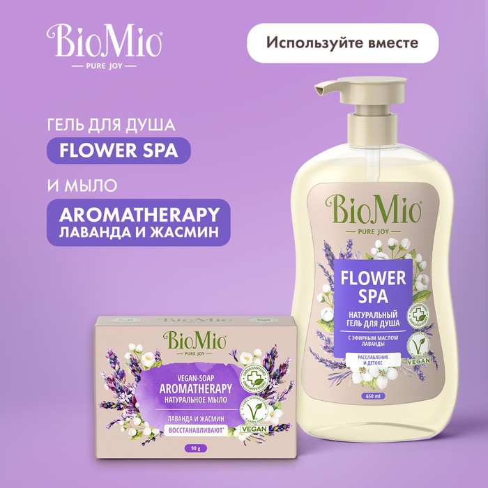 Натуральное веганское мыло BioMio AROMATHERAPY «Лаванда и Жасмин» заботится о вашей коже и настроении! Эфирное масло лаванды расслабляет и балансирует эмоции. Гидролат цветов жасмина увлажняет и питает кожу. Оливковое масло и витамин Е закрепляют эффект увлажнения. Эфирное масло мяты успокаивает кожу. Ионы серебра оказывают мягкий антибактериальный эффект.