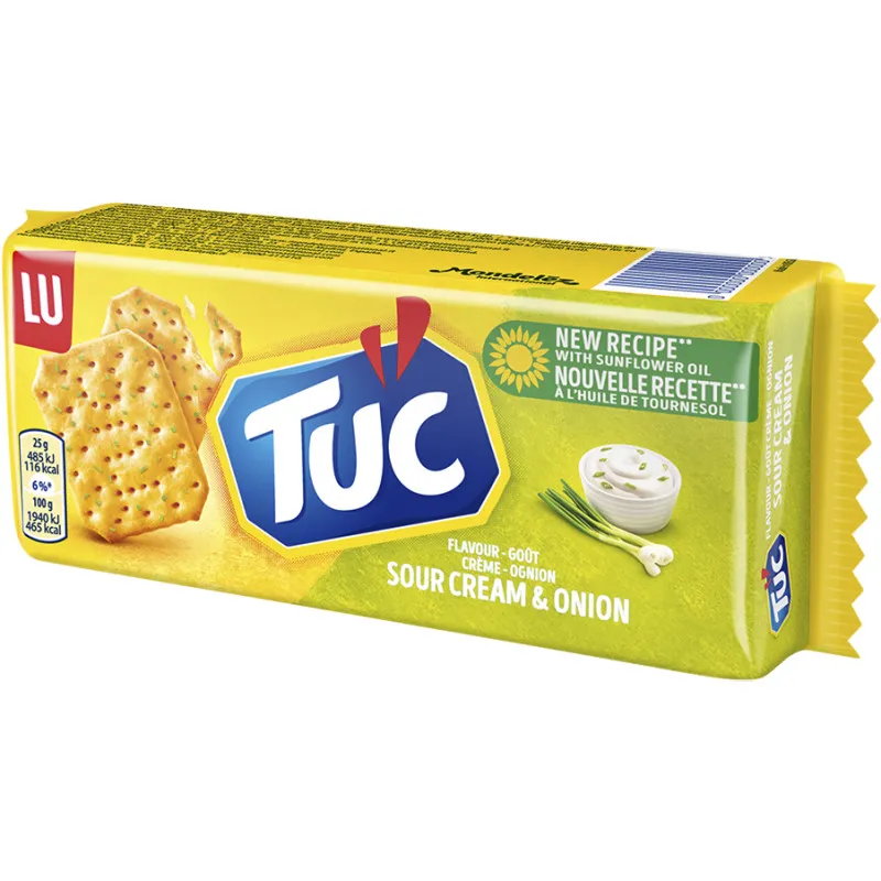 Идеально для любого праздника и вечеринки – TUC со сметаной и луком. Привносит свежий вкус весеннего лука и сметаны. Это самый популярный вкус в семействе соленых крекеров TUC! Упаковка 100 г.