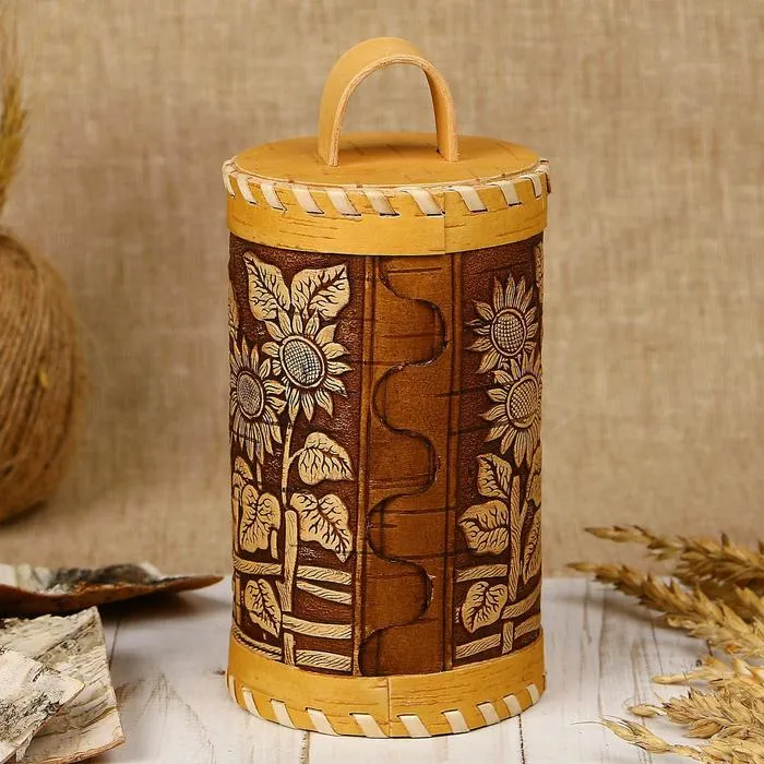 Традиционная технология изготовления из натуральной берёзовой коры сочетается с изящным тиснением в виде подсолнухов, создавая неповторимый народный колорит. Восковое покрытие подчеркивает естественную фактуру материала, сохраняя его природные свойства.
