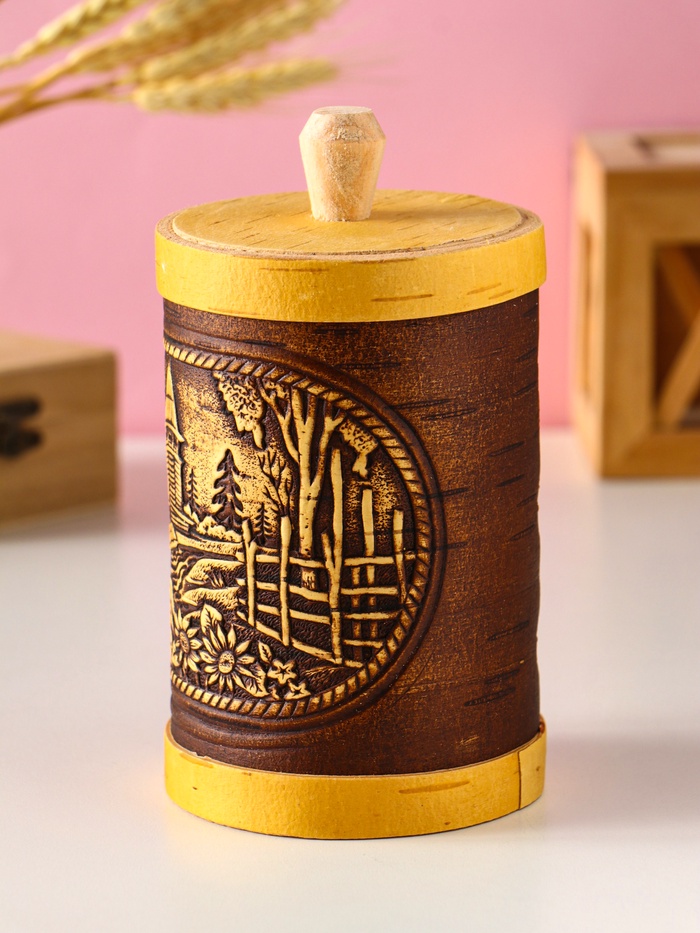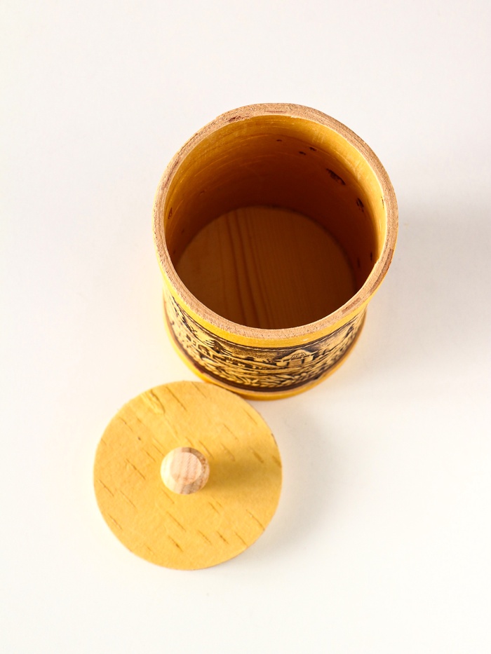 - Деревянная крышка: Крышка из дерева плотно прилегает к основанию, надежно защищая содержимое от пыли и влаги. Натуральные материалы — береста и дерево — идеально сочетаются друг с другом.
