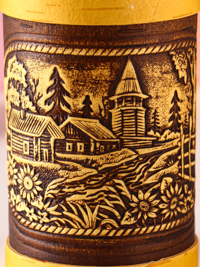 - Рельефный рисунок: Поверхность туеса украшена традиционным орнаментом методом горячего прессования. Каждый узор уникален, так как береста имеет естественные оттенки от бежевого до коричневого.