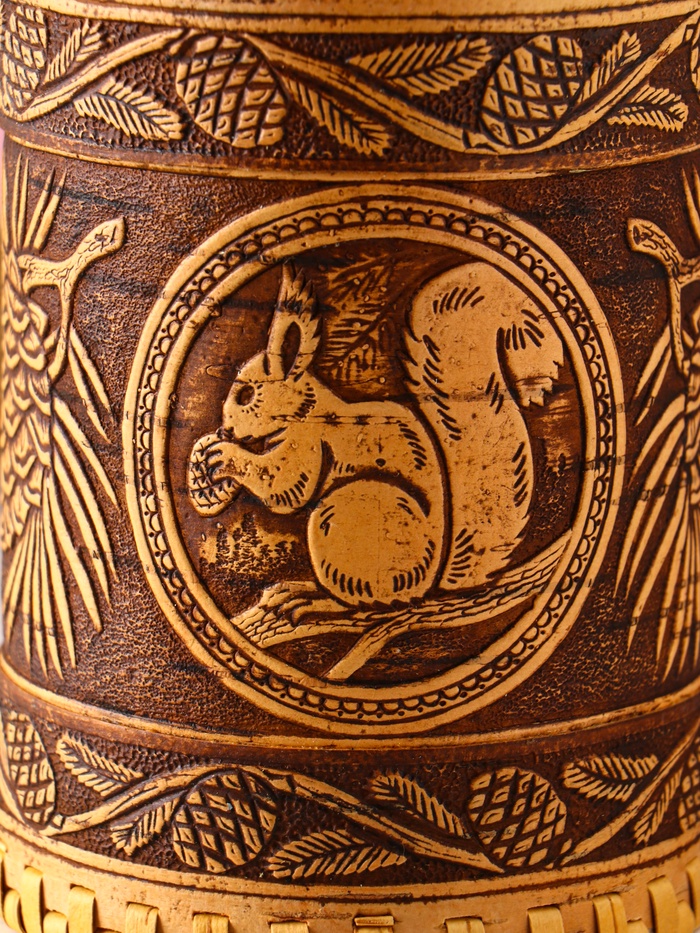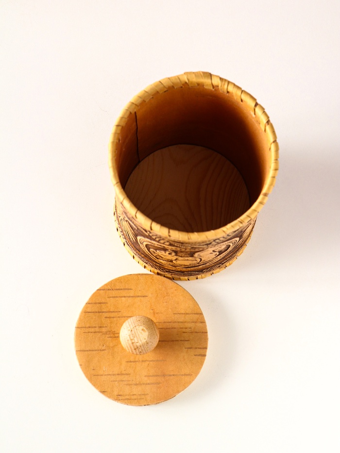 - Рельефный рисунок: Поверхность туеса украшена тиснением методом горячего прессования. Узор «Лесная красавица» не выцветает и не стирается со временем, придавая изделию характер ручной работы.