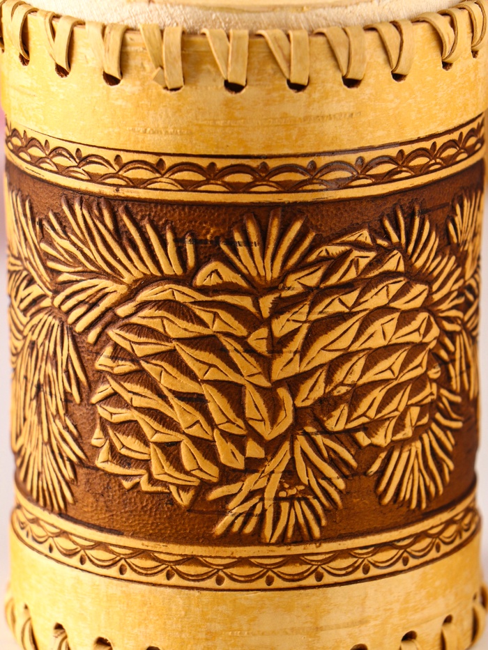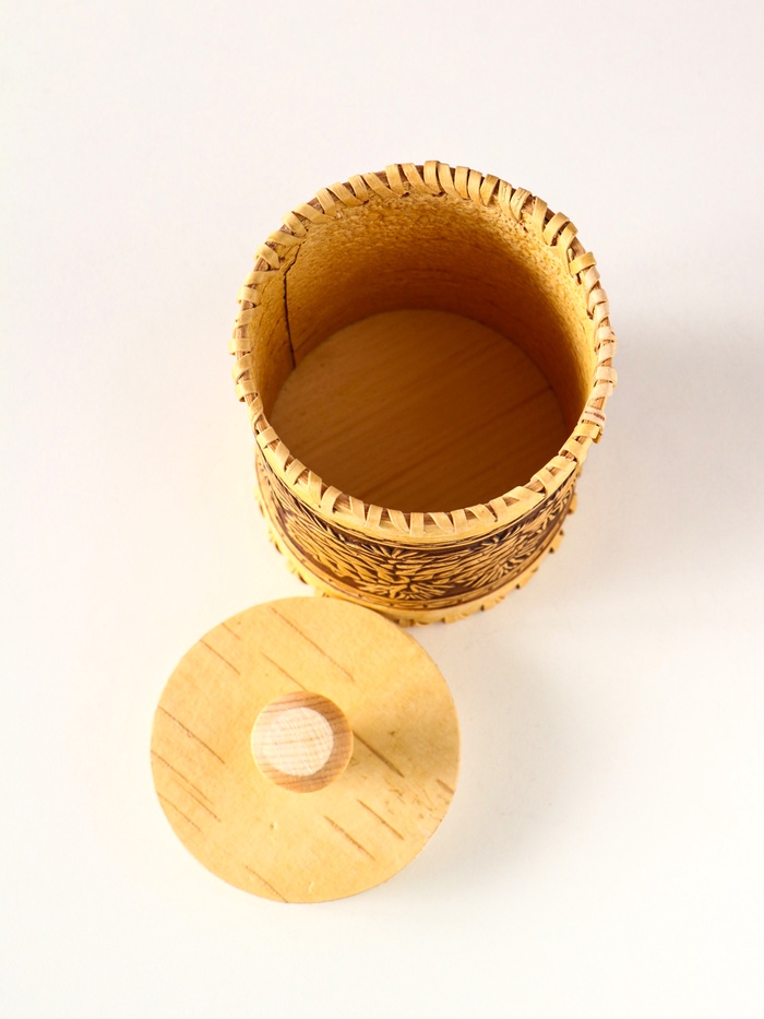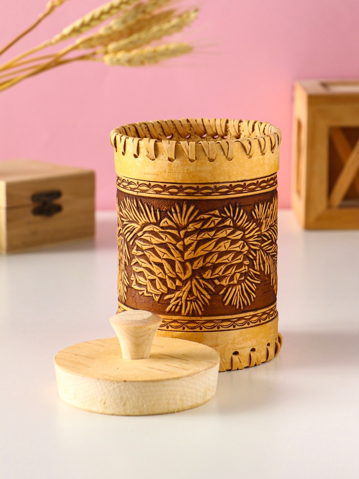 - Натуральная береста с рельефным узором: Каждый туес имеет уникальную текстуру дерева и ручное тиснение методом горячего прессования в виде шишек. Такой орнамент создает особое настроение и напоминает о прогулке по хвойному лесу. Береста — живой материал, она обладает природной энергетикой.