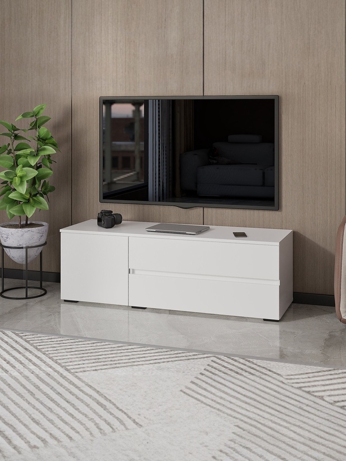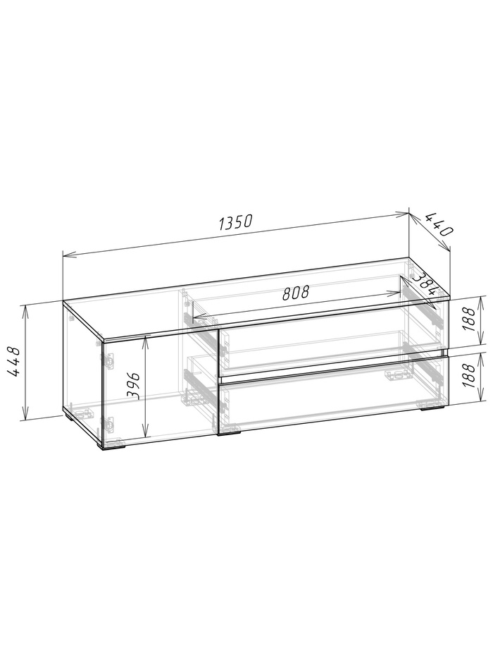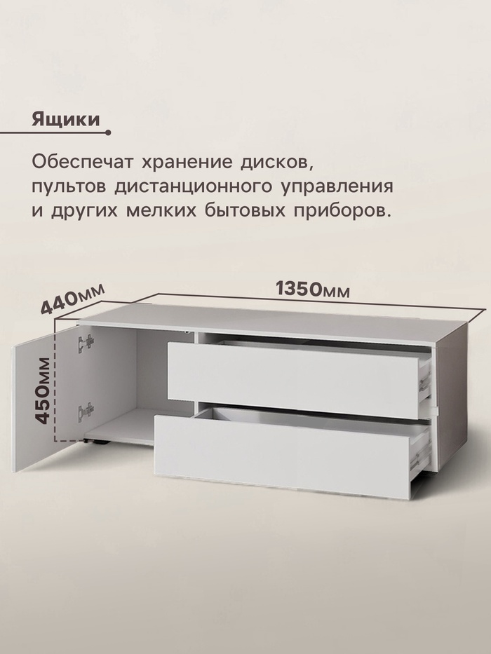 - Просторные ящики: два вместительных выдвижных ящика и ниша с дверцой, обеспечат хранение дисков, пультов дистанционного управления и других мелких бытовых приборов.