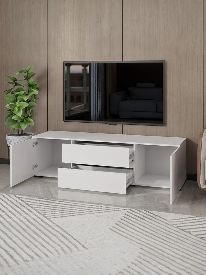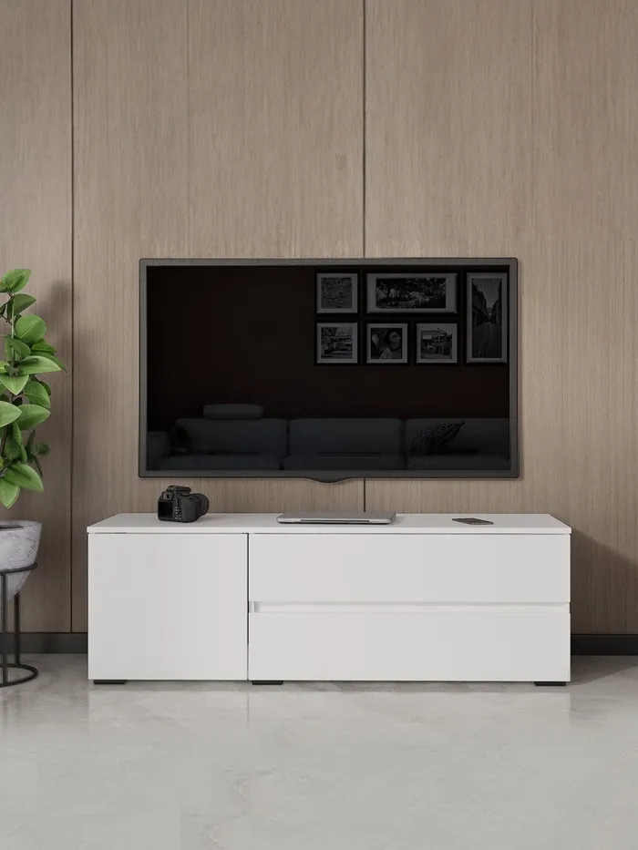 Функциональная мебель, предназначенная для размещения телевизора и сопутствующих устройств. В тумбе можно хранить пульты, кабели, диски, игровые приставки и другие предметы, связанные с использованием телевизора, что помогает поддерживать порядок в комнате.