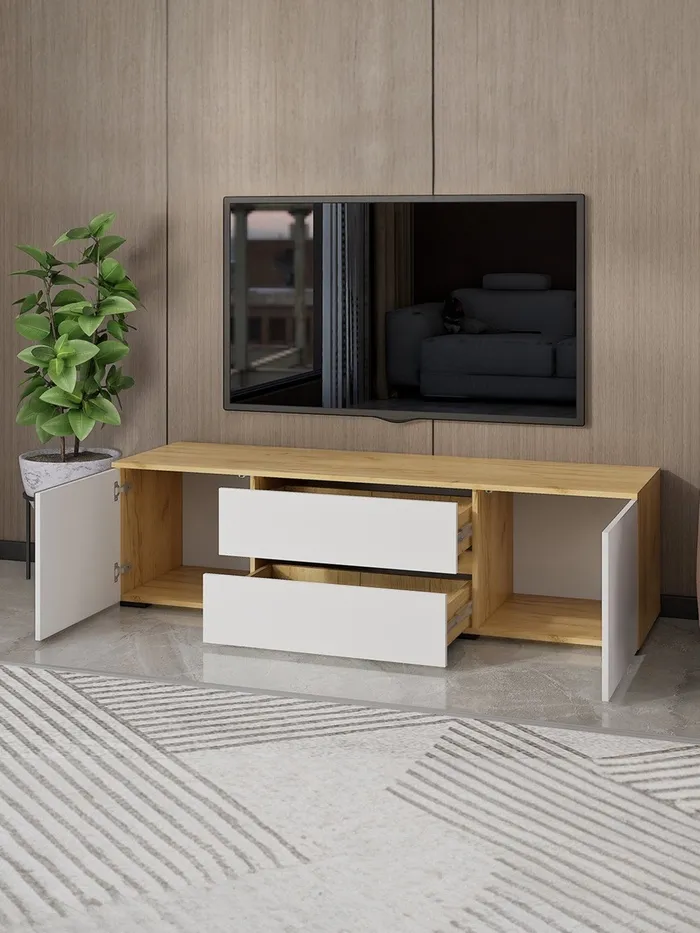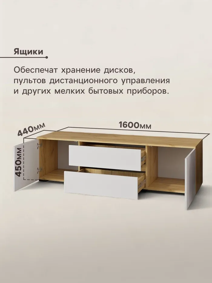 - Просторные ящики: два вместительных выдвижных ящика и две ниши с дверцами, обеспечат хранение дисков, пультов дистанционного управления и других мелких бытовых приборов.