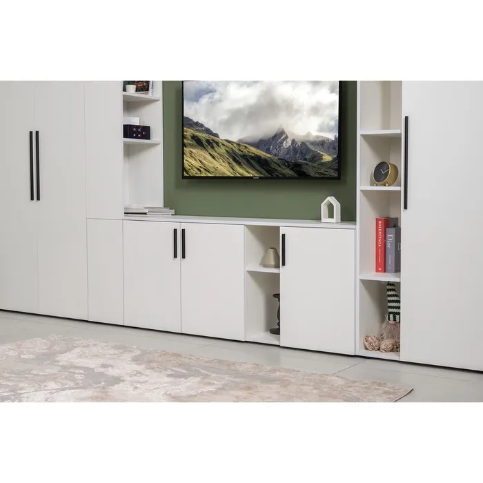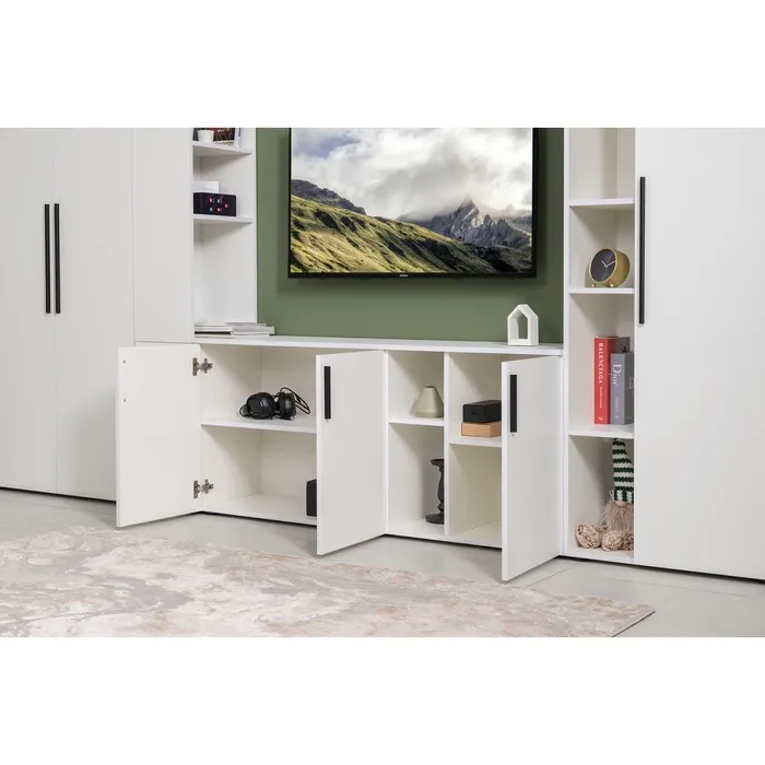 - Функциональность: две закрытые секции с дверцами и одна открытая полка обеспечивают удобное хранение вещей, сочетая закрытые и открытые зоны.