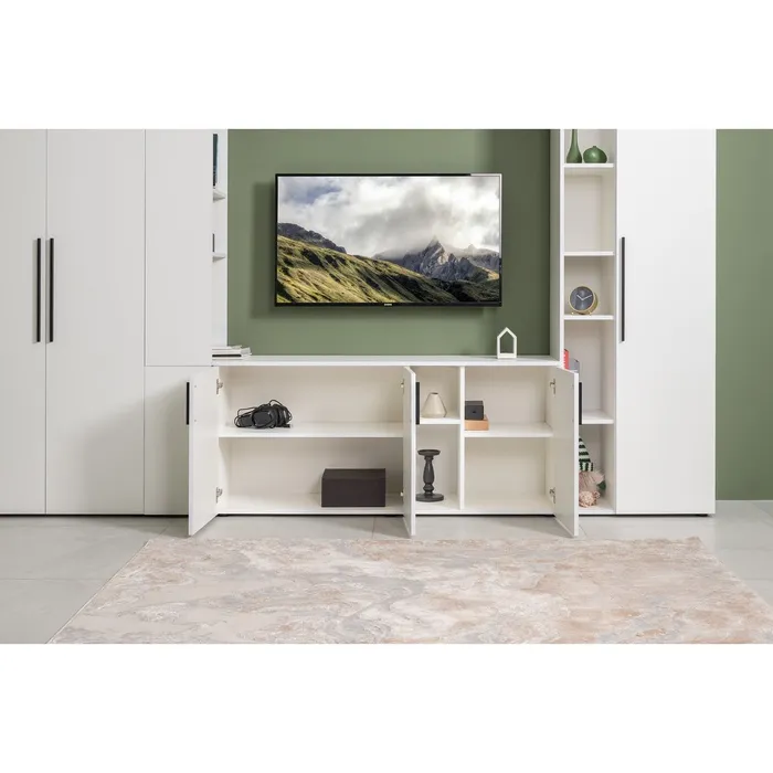 - Гостиных и спален: тумба идеально подходит для размещения под телевизором, создавая организованное и стильное пространство.