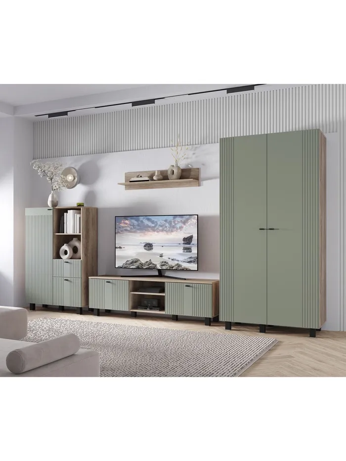 - Вместимость: столешница под ТВ, закрытые секции и ниши для хранения техники