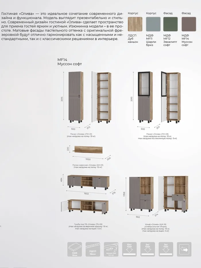 - Фасад: МДФ с декоративной фрезеровкой, пастельный матовый оттенок