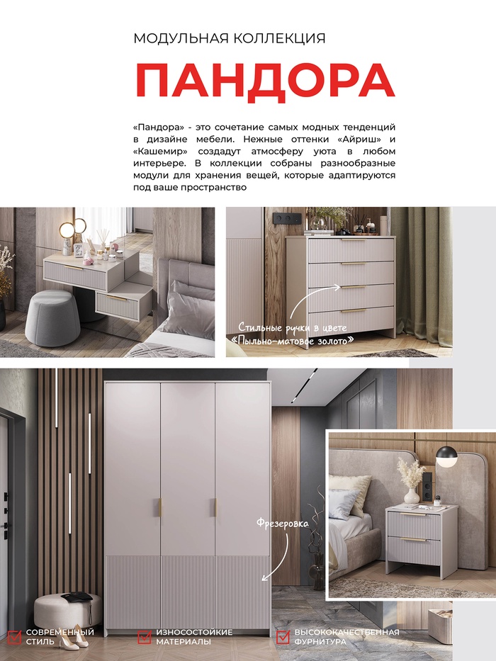 Каждый модуль коллекции разработан с учётом эргономики и адаптируется под различные пространства: от спальни до прихожей. В коллекцию «Пандора» входят тумбы, комоды и вместительные шкафы, оформленные в едином стиле с акцентами на фасады с фрезеровкой и стильные ручки в оттенке «пыльно – матовое золото».