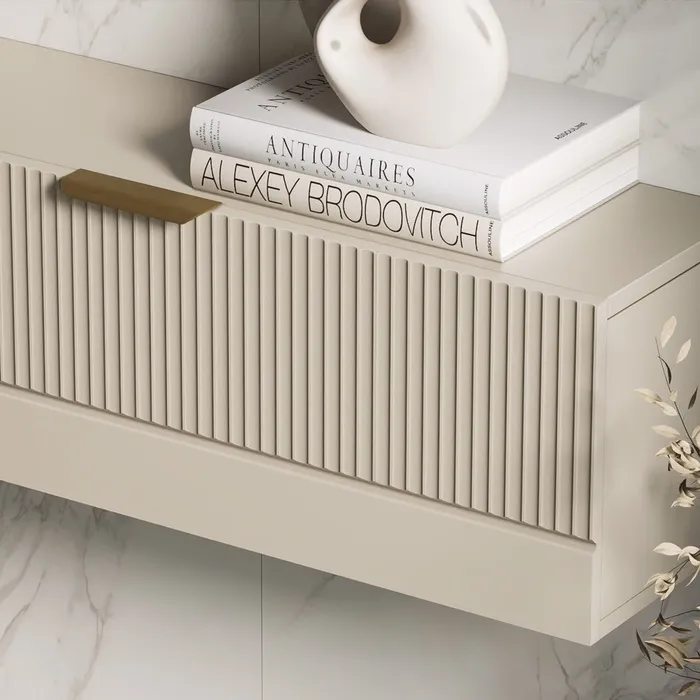 - Современный дизайн: бежевый матовый или кашемировый оттенок и лаконичные формы с фрезеровкой на фасадах дверок делают тумбу стильным и элегантным решением для любого интерьера.
