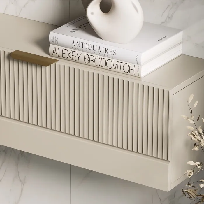 - Современный дизайн: бежевый матовый или кашемировый оттенок и лаконичные формы с фрезеровкой на фасадах дверок делают тумбу стильным и элегантным решением для любого интерьера.