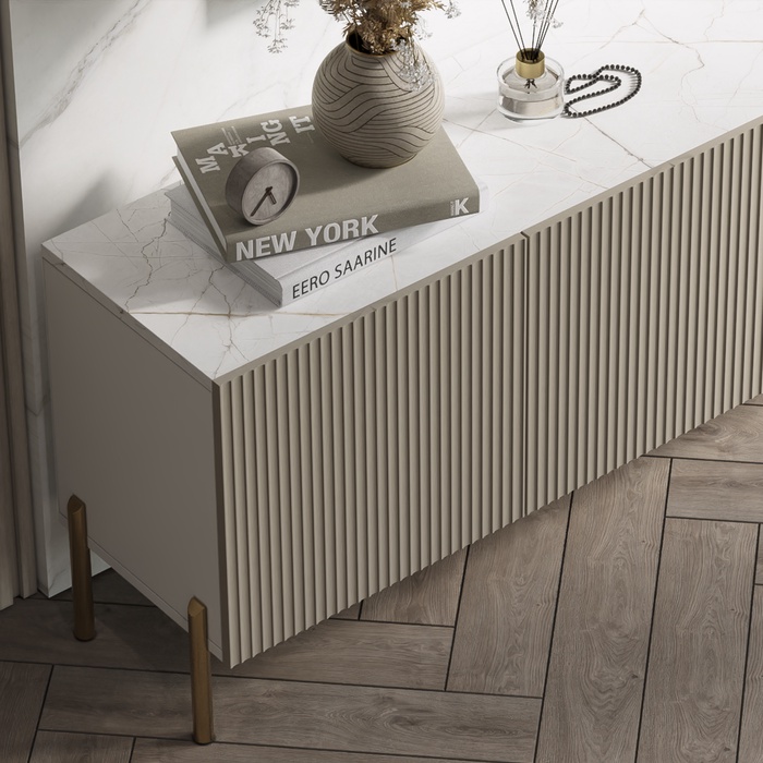 - Современный дизайн: мраморный матовый или кашемировый оттенок и лаконичные формы с фрезеровкой на фасадах дверок делают тумбу стильным и элегантным решением для любого интерьера.
