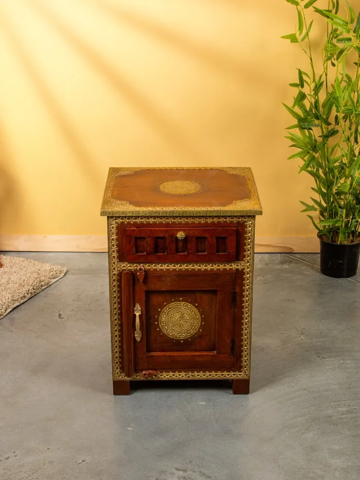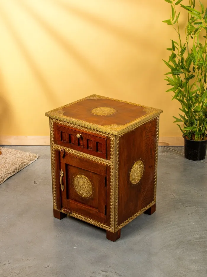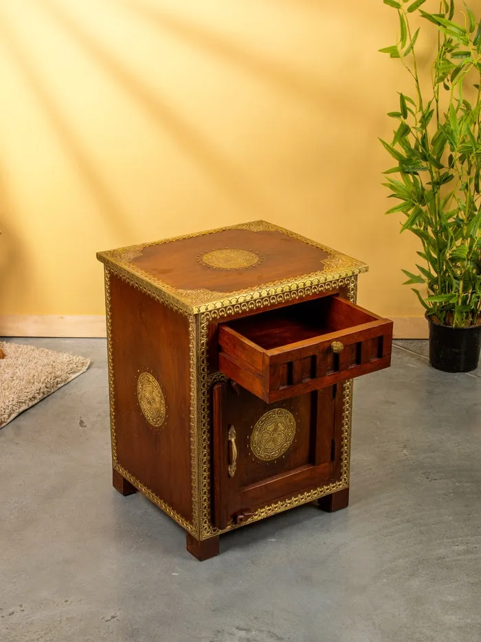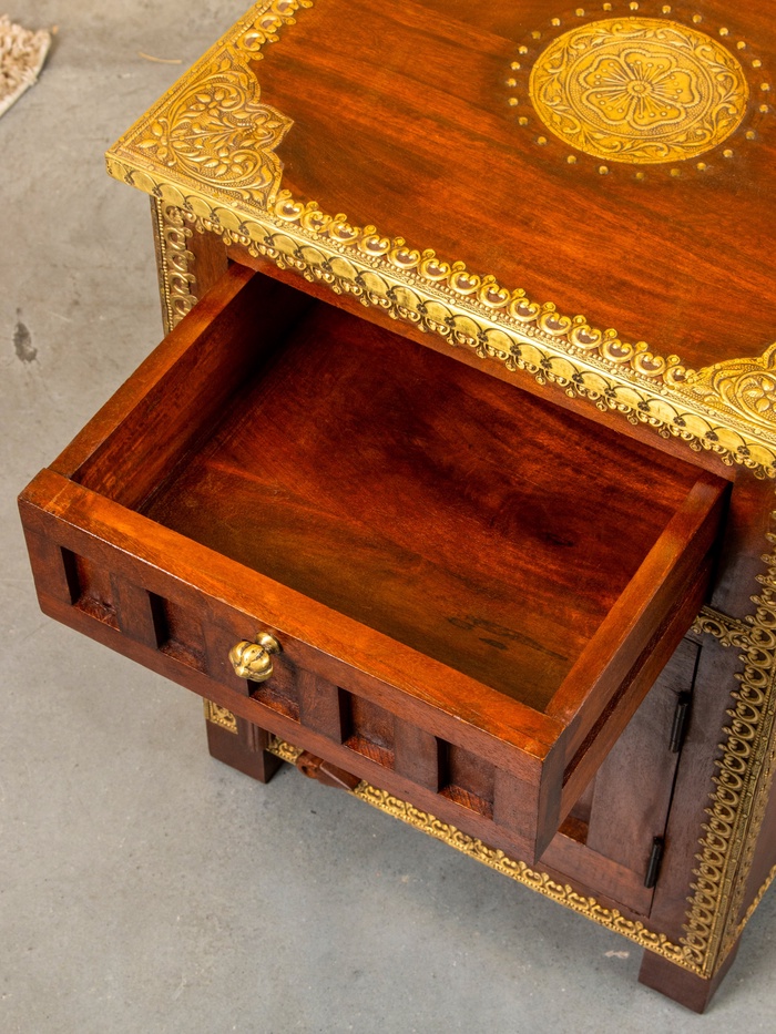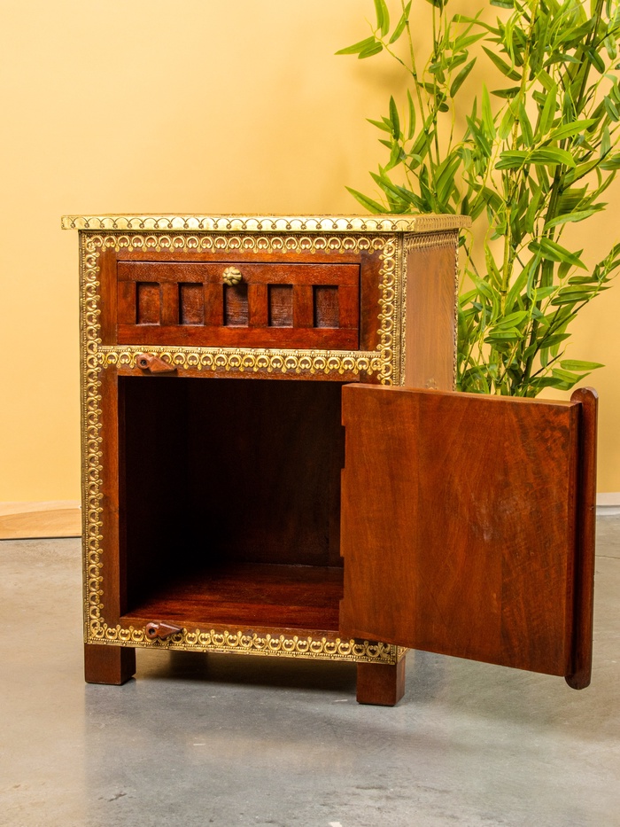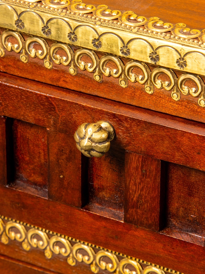 Прикроватная тумба из натурального дерева размером 45×40×61 см в благородном оттенке венге. Два просторных ящика с латунной фурнитурой обеспечивают удобное хранение мелочей. Готовая к использованию конструкция с фрезеровкой деталей - практичное решение для спальни.