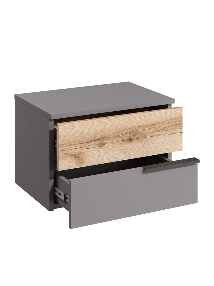 Стильная и функциональная тумба с двумя вместительными ящиками. Изготовлен из практичного ЛДСП в современном сочетании цветов серый шифер и дуб делано.