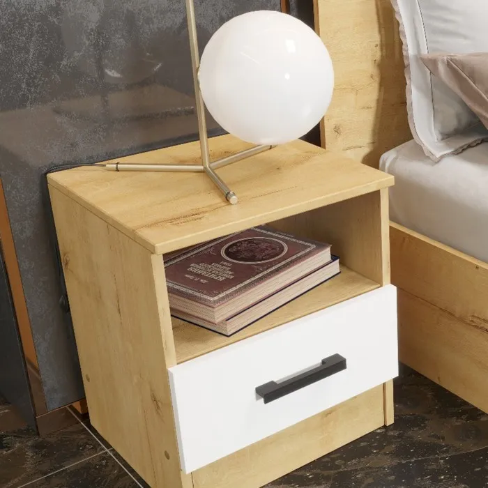• Функциональность: тумба оснащена одним ящиком для хранения мелочей и открытой нишей, где можно разместить книги, часы или другие предметы. Верхняя поверхность тумбы может быть использована для размещения декоративных предметов, рамок с фотографиями или других аксессуаров.